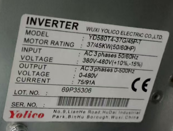 電機(jī)45KW,額定電流91A,額定轉(zhuǎn)速1480rpm,根據(jù)電機(jī)的型號(hào),我司選擇了額定電流91A的型號(hào)為YD580T4-37G/45P-T變頻器